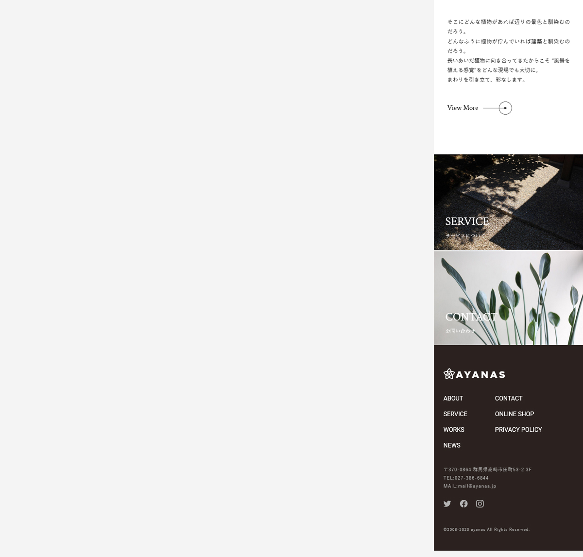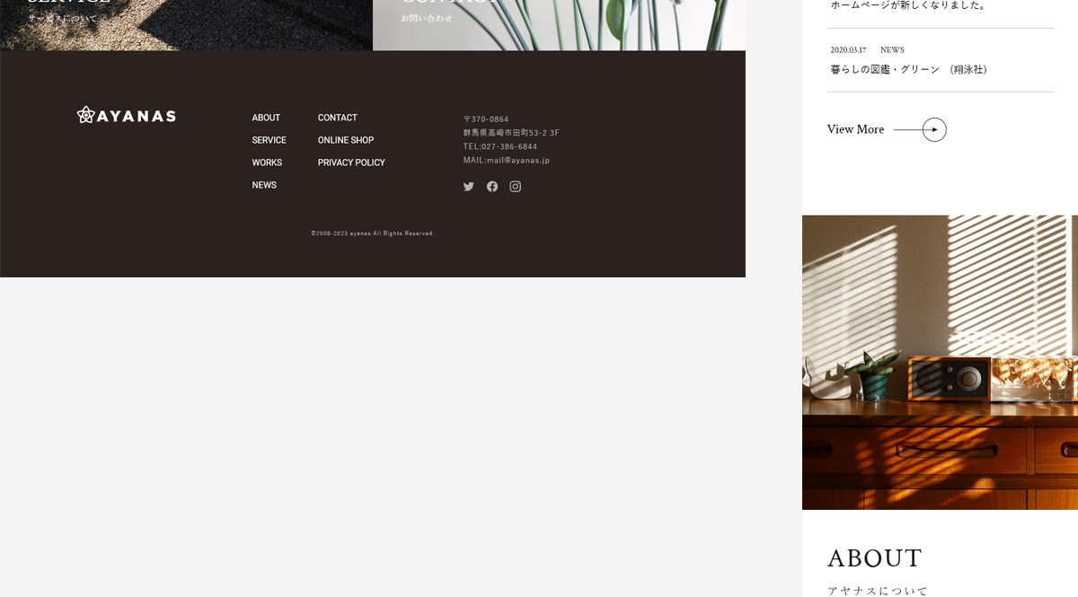 AYANAS WEBサイトJan,2021websiteOpen this web siteBack to indexclient AYANAS様 direction 岡田ジュン(AIR) / 寺居和美(AIR) design 相川直希 coding 鈴木一人(AIR)