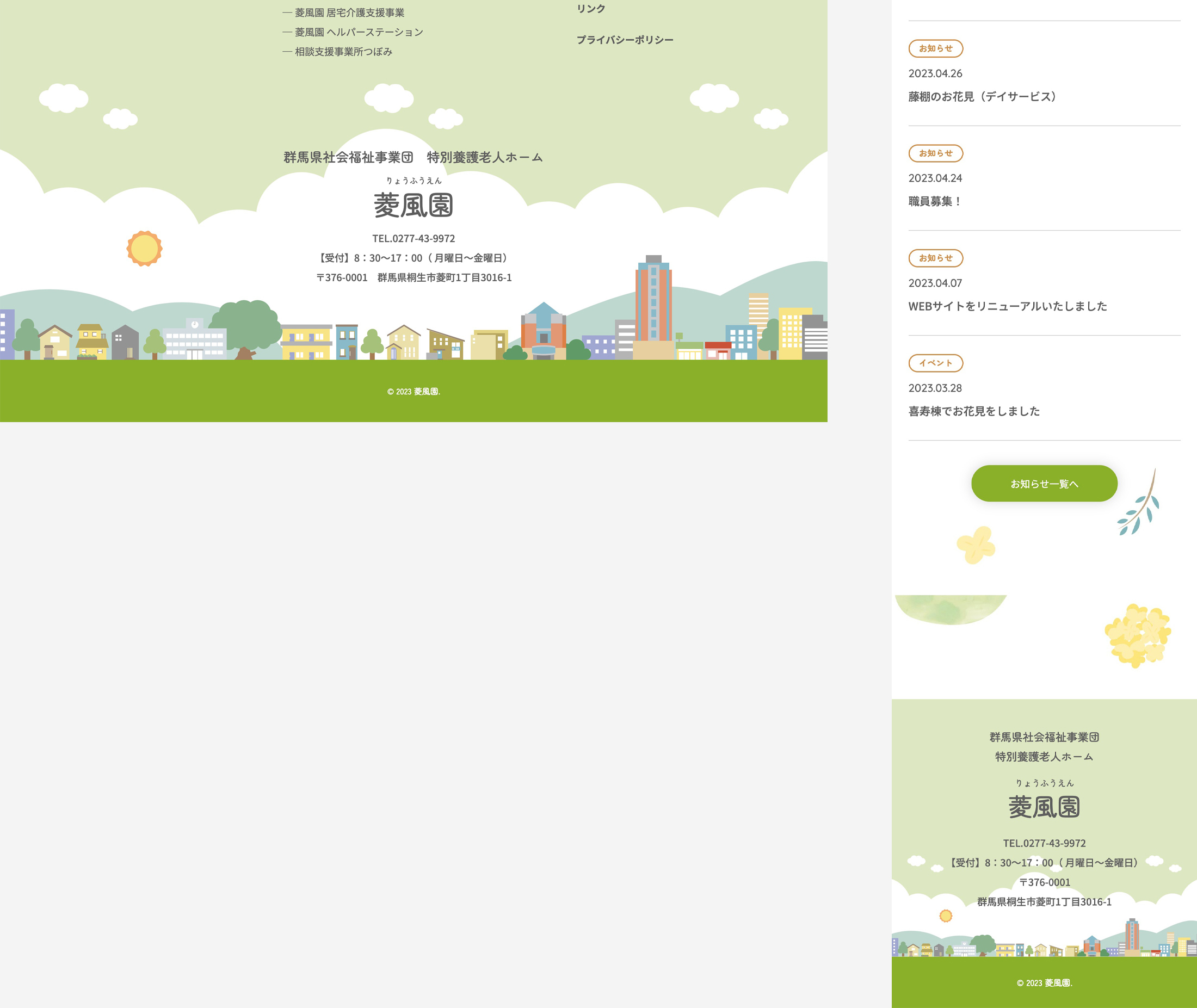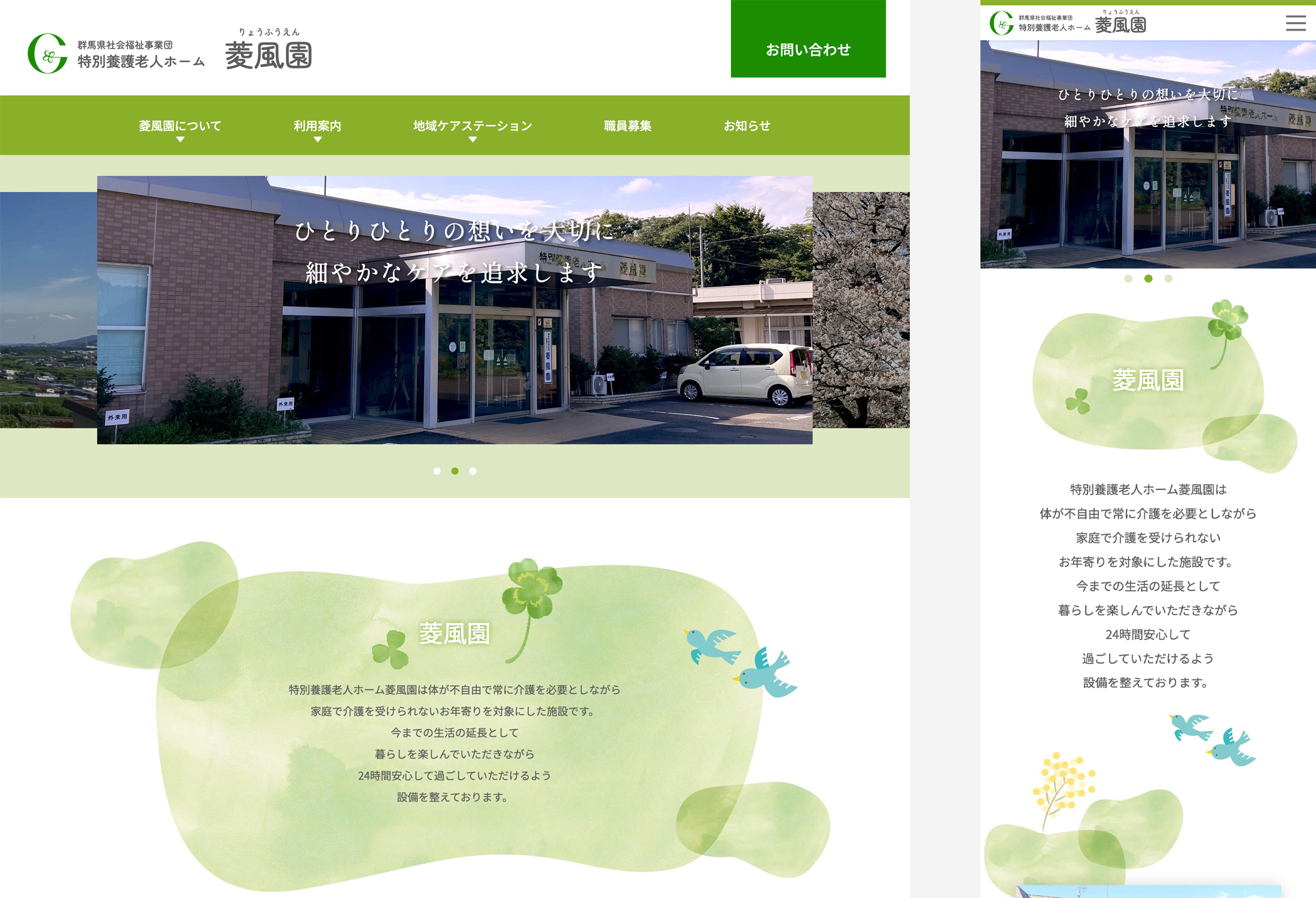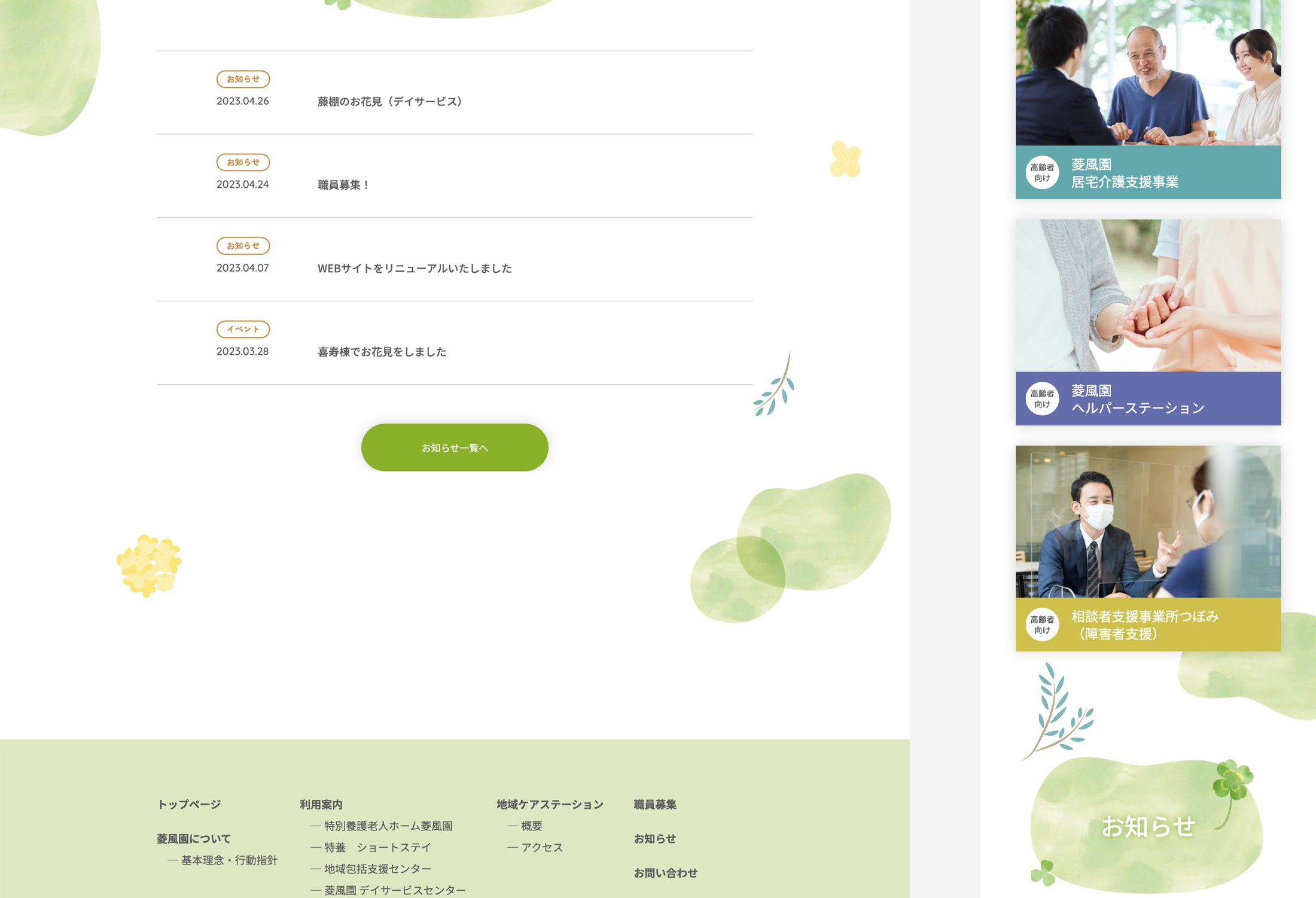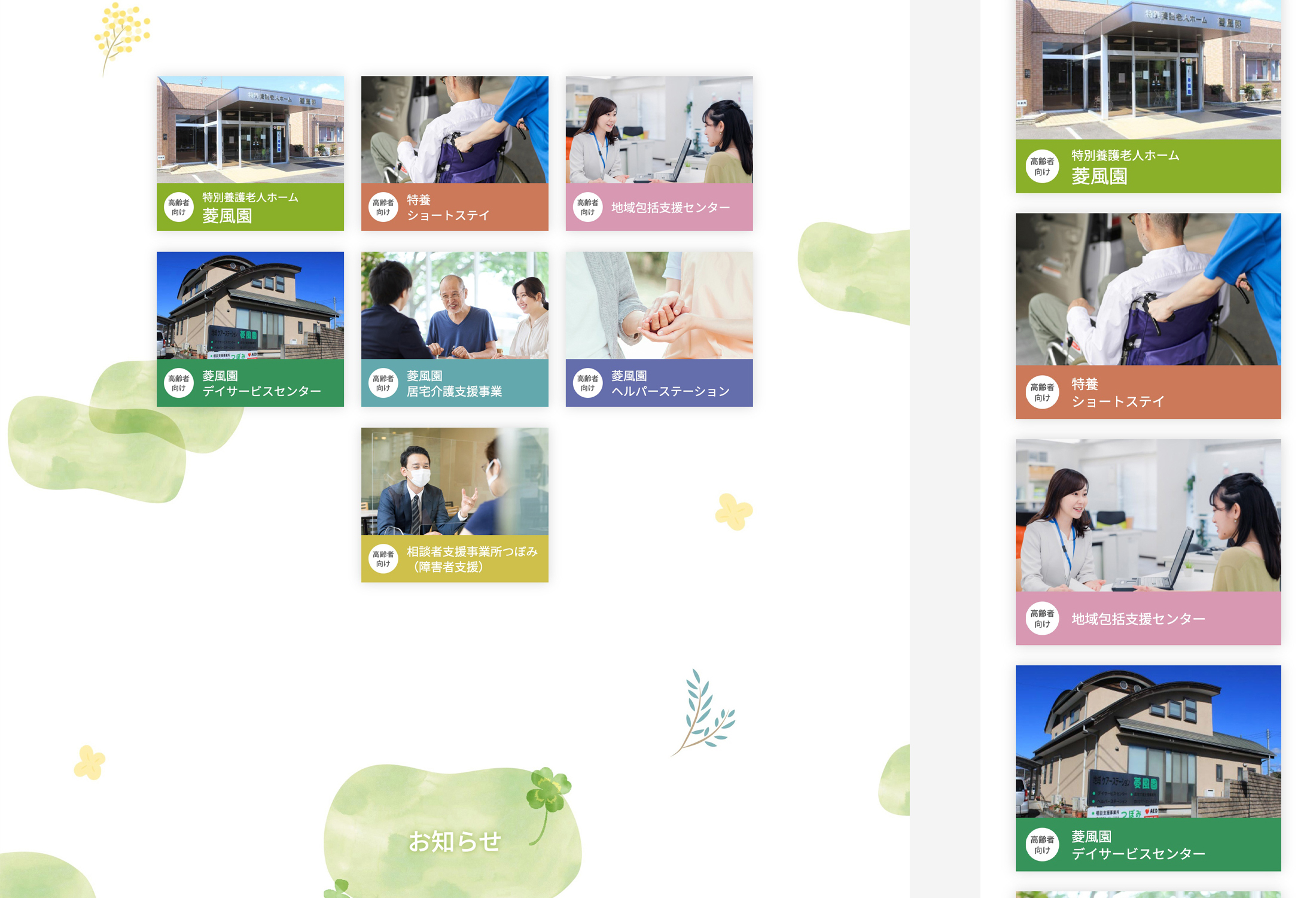 群馬県社会福祉事業団 特別養護老人ホーム 菱風園 WEBサイトApr,2023websiteOpen this web siteBack to indexclient 群馬県社会福祉事業団様 direction 岡田ジュン(AIR) / 寺居和美(AIR) design 善養寺良子 coding 神戸善則(SHINME)